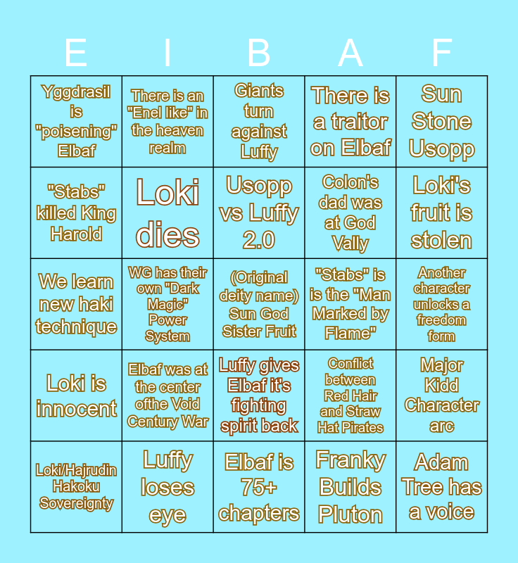 This bingo card has 25 words: Loki is innocent, Luffy loses eye, (Original deity name) Sun God Sister Fruit, Franky Builds Pluton, Sun Stone Usopp, Yggdrasil is "poisening" Elbaf, There is an "Enel like" in the heaven realm, Giants turn against Luffy, "Stabs" is is the "Man Marked by Flame", Major Kidd Character arc, "Stabs" killed King Harold, Loki dies, Elbaf is 75+ chapters, Conflict between Red Hair and Straw Hat Pirates, Loki's fruit is stolen, Loki/Hajrudin Hakoku Sovereignty, WG has their own "Dark Magic" Power System, Usopp vs Luffy 2.0, Colon's dad was at God Vally, Another character unlocks a freedom form, We learn new haki technique, Elbaf was at the center ofthe Void Century War, Luffy gives Elbaf it's fighting spirit back, There is a traitor on Elbaf and Adam Tree has a voice.
