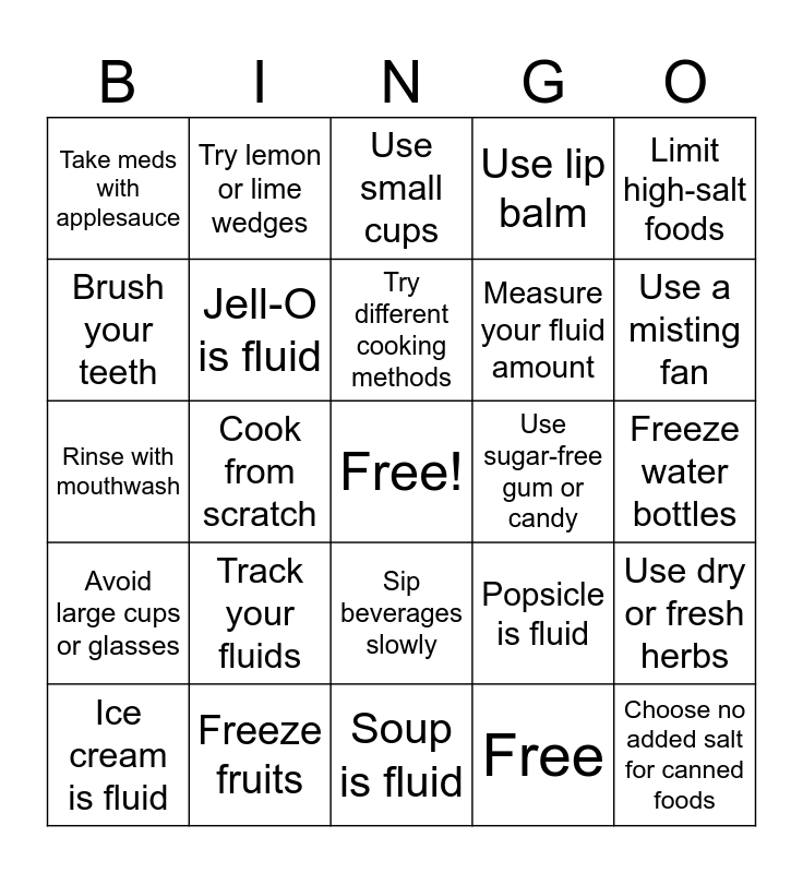 This bingo card has a free space and 25 words: Track your fluids, Soup is fluid, Try different cooking methods, Ice cream is fluid, Limit high-salt foods, Take meds with applesauce, Brush your teeth, Try lemon or lime wedges, Use sugar-free gum or candy, Sip beverages slowly, Measure your fluid amount, Rinse with mouthwash, Popsicle is fluid, Use dry or fresh herbs, Jell-O is fluid, Stay cool and dress in light clothing, Freeze water bottles, Use small cups, Use a misting fan, Cook from scratch, Choose no added salt for canned foods, Freeze fruits, Avoid large cups or glasses, Use lip balm and Free.