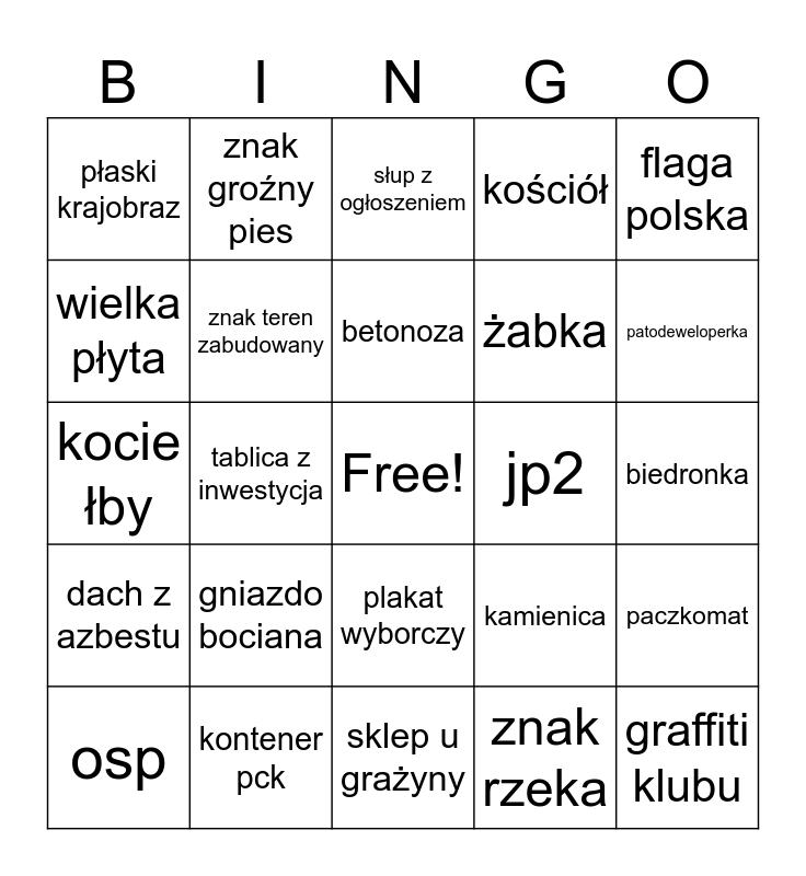 This bingo card has a free space and 24 words: gniazdo bociana, kontener pck, betonoza, osp, flaga polska, płaski krajobraz, wielka płyta, znak groźny pies, jp2, plakat wyborczy, żabka, kocie łby, kamienica, paczkomat, znak teren zabudowany, znak rzeka, biedronka, słup z ogłoszeniem, patodeweloperka, tablica z inwestycja, graffiti klubu, dach z azbestu, kościół and sklep u grażyny.
