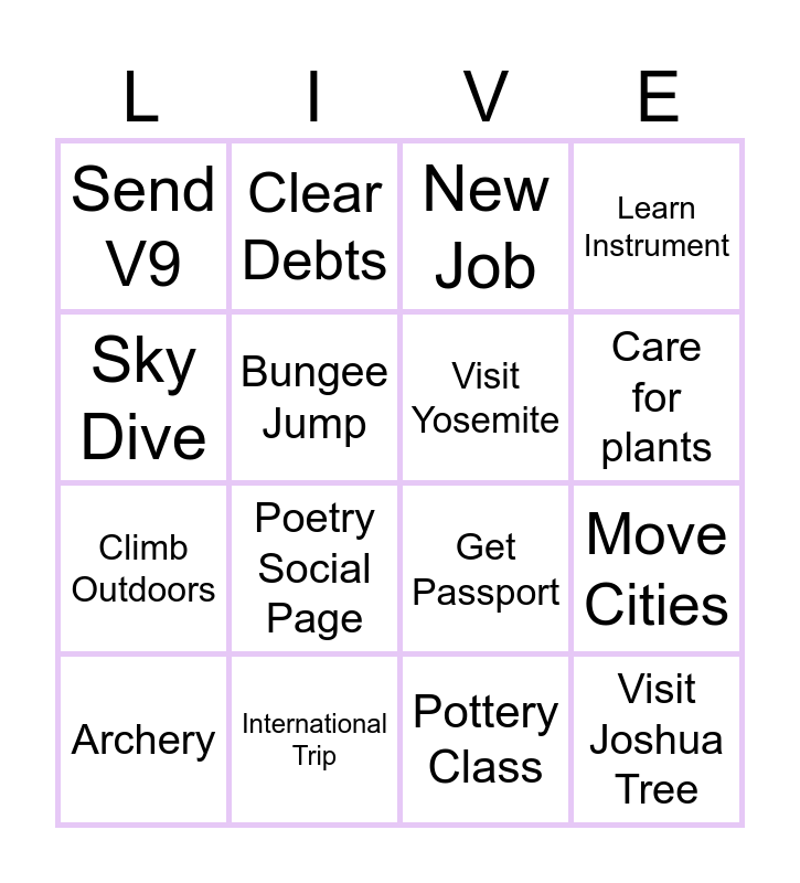 This bingo card has 16 words: International Trip, Move Cities, New Job, Send V9, Climb Outdoors, Clear Debts, Get Passport, Pottery Class, Sky Dive, Bungee Jump, Archery, Learn Instrument, Poetry Social Page, Care for plants, Visit Yosemite and Visit Joshua Tree.