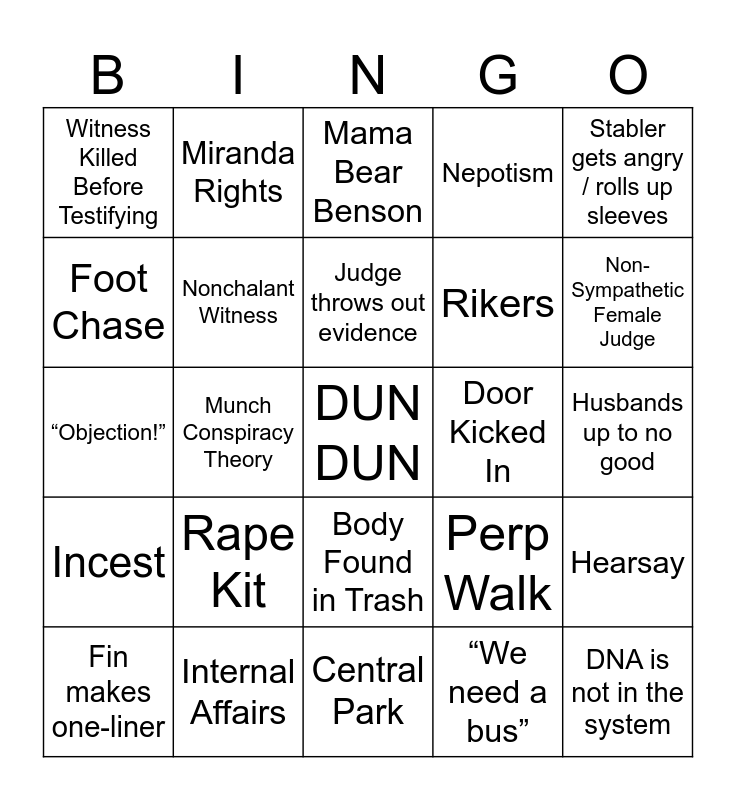 This bingo card has a free space and 34 words: Special Guest is Perp, “We need a bus”, Victim Interviewed at Hospital, Detective has to Testify, Incest, Nonchalant Witness, Stabler gets angry / rolls up sleeves, Fin makes one-liner, Miranda Rights, Blunt Force Trauma, Judge throws out evidence, Mama Bear Benson, unrealistically enhanced surveillance video, Police Lineup, Door Kicked In, Non-Sympathetic Female Judge, Internal Affairs, “Objection!”, Rape Kit, Perp Walk, Body Found in Trash, “It was consensual”, Witness Killed Before Testifying, Husbands up to no good, Central Park, DNA is not in the system, Nepotism, Dr. Huang makes an appearance, Rikers, Foot Chase, The People Request Remand, Munch Conspiracy Theory, Hearsay and M.E. visits the crime scene.