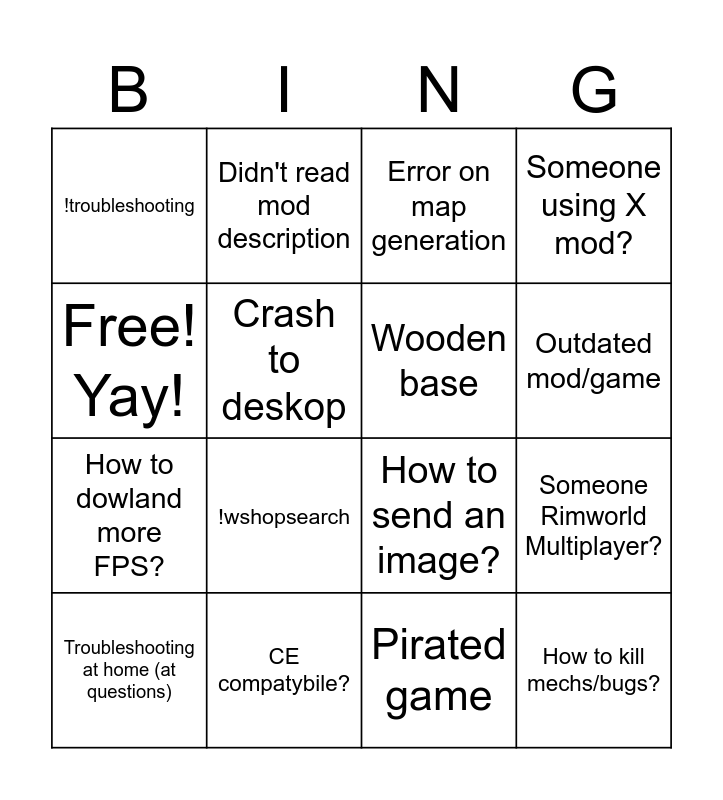 This bingo card has 16 words: CE compatybile?, Someone Rimworld Multiplayer?, Error on map generation, !troubleshooting, How to dowland more FPS?, Didn't read mod description, How to send an image?, Pirated game, Free! Yay!, Crash to deskop, Troubleshooting at home (at questions), Someone using X mod?, !wshopsearch, Outdated mod/game, Wooden base and How to kill mechs/bugs?.