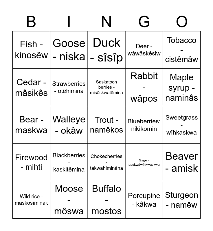 This bingo card has 28 words: Beaver - amisk, Muskrat - wacask, Rabbit - wâpos, Porcupine - kâkwa, Cedar - mâsikês, Duck - sîsîp, Goose - niska, Firewood - mihti, Blueberries: nikikomin, Wild rice - maskosîminak, Bear - maskwa, Deer - wâwâskêsiw, Moose - môswa, Buffalo - mostos, Maple syrup - naminâs, Raspberries - ayôskanak, Blackberries - kaskitêmina, Strawberries - otêhimina, Saskatoon berries - misâskwatômina, Chokecherries - takwahiminâna, Fish - kinosêw, Sturgeon - namêw, Trout - namêkos, Walleye - okâw, Sweetgrass - wîhkaskwa, Sage - paskwâwîhkwaskwa, Tobacco - cistêmâw and Cedar - mâsikês.