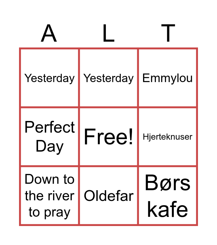⚠ This card has duplicate items: ABBA medley (3), Africa (3), All you need is love (3), Blackbird (3), Busstop (3), Børs kafe (3), Come together (3), Dans dans med oss (3), Den finast eg veit (3), Down to the river to pray (3), Duvan (3), Emmylou (3), En øl i handa (3), God only knows (3), Good bye Yellow brick road (3), Gressholmen (3), He aint heavy.... hes my brother (3), Hey Jude (3), Hjerteknuser (3), I wanna be the only one (3), Jan Teigen medley (3), Kan jag få låna den av deg (3), Kor e alle helter hen (3), Månemannen (3), Nine to five (3), Oldefar (3), Perfect Day (3), Rolling in the deep (3), Skyeboat Song (3), Something (3), Ti tusen tommeltotta (3), Umbrella (3), Victor Jara (3), Vippetangen konditori (3), Viva la Vida (3), Vänskap (3), We will rock you (3), When you are smiling (3), Will You be there (3), Wish you were here (3), Yesterday (3), You can leave your hat on (3)