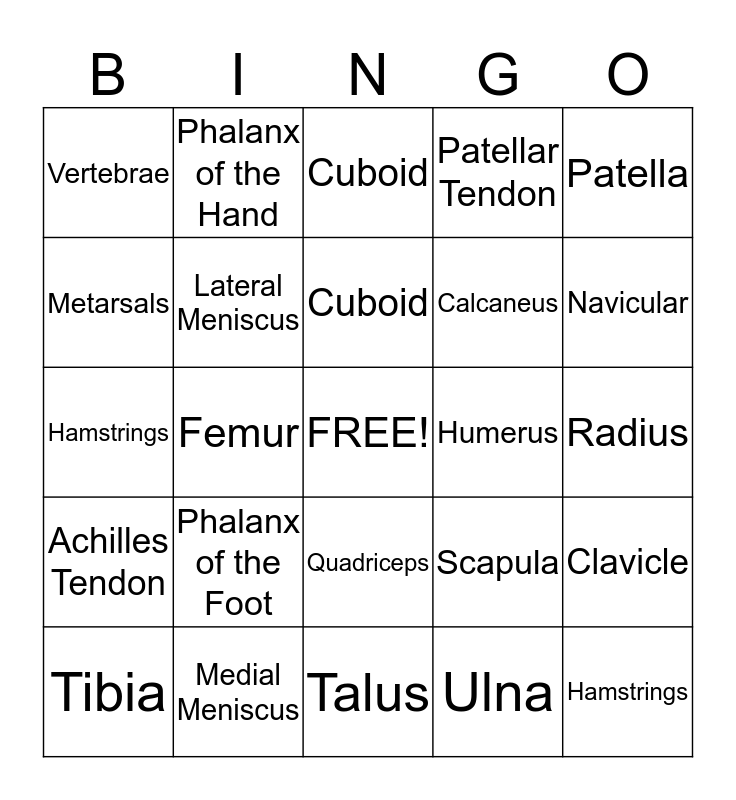 This bingo card has a free space and 24 words: Phalanx of the Foot, Medial Meniscus, Cuboid, Tibia, Patella, Vertebrae, Metarsals, Phalanx of the Hand, Humerus, Quadriceps, Calcaneus, Hamstrings, Scapula, Clavicle, Lateral Meniscus, Ulna, Radius, Cuboid, Navicular, Femur, Hamstrings, Achilles Tendon, Patellar Tendon and Talus.