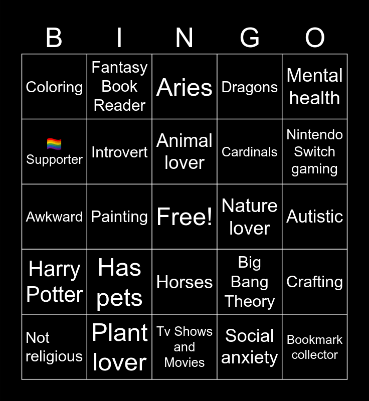 This bingo card has a free space and 24 words: Not religious, Has pets, Animal lover, Social anxiety, Mental health, Coloring, Fantasy Book Reader, Aries, Nature lover, Autistic, Awkward, Introvert, Big Bang Theory, Crafting, 🏳️🌈 Supporter, Plant lover, Tv Shows and Movies, Dragons, Nintendo Switch gaming, Harry Potter, Painting, Horses, Cardinals and Bookmark collector.