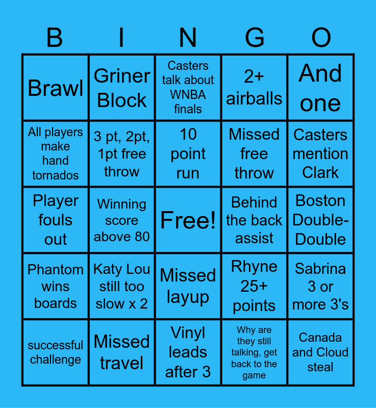 This bingo card has a free space and 24 words: Katy Lou still too slow x 2, Missed travel, 10 point run, successful challenge, And one, Brawl, All players make hand tornados, Griner Block, Behind the back assist, Missed layup, Missed free throw, Player fouls out, Rhyne 25+ points, Sabrina 3 or more 3's, 3 pt, 2pt, 1pt free throw, Why are they still talking, get back to the game, Boston Double-Double, Casters talk about WNBA finals, Casters mention Clark, Winning score above 80, Canada and Cloud steal, Phantom wins boards, 2+ airballs and Vinyl leads after 3.