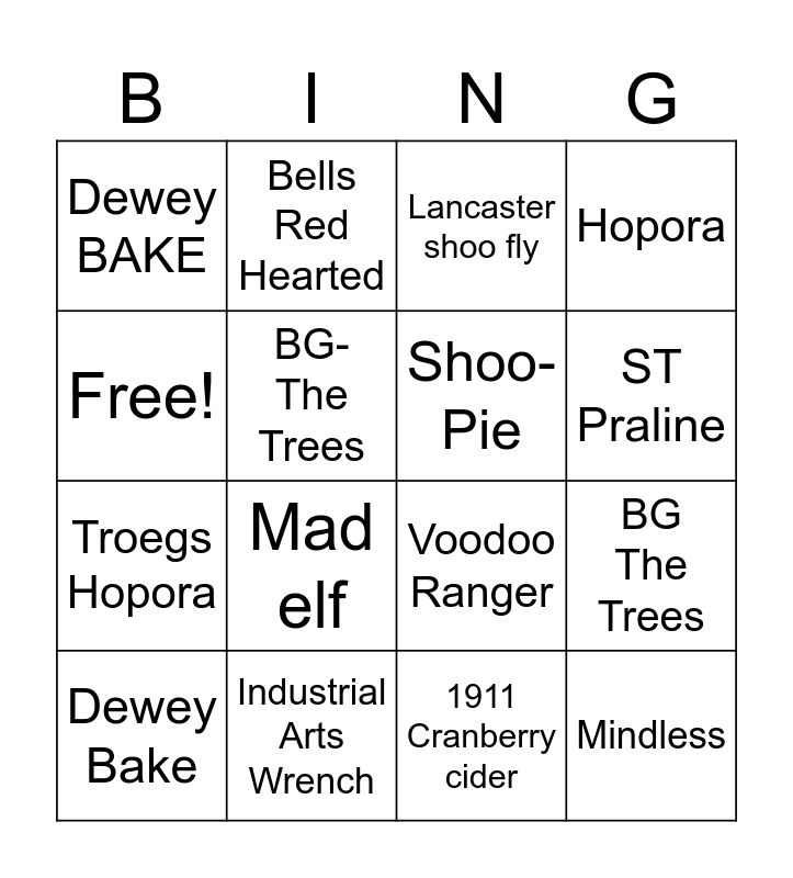 This bingo card has 16 words: Industrial Arts Wrench, BG The Trees, Lancaster shoo fly, Dewey BAKE, Troegs Hopora, Bells Red Hearted, Voodoo Ranger, 1911 Cranberry cider, Free!, BG-The Trees, Dewey Bake, Hopora, Mad elf, ST Praline, Shoo-Pie and Mindless.