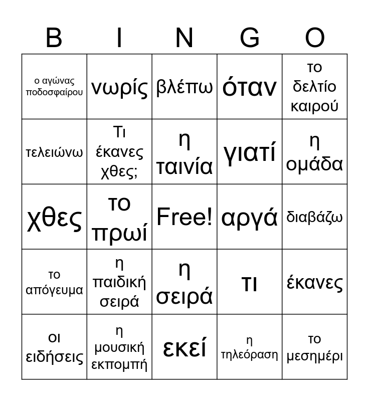 This bingo card has a free space and 24 words: η παιδική σειρά, η μουσική εκπομπή, η ταινία, οι ειδήσεις, το δελτίο καιρού, ο αγώνας ποδοσφαίρου, τελειώνω, νωρίς, αργά, η σειρά, γιατί, χθες, τι, έκανες, Τι έκανες χθες;, η τηλεόραση, διαβάζω, βλέπω, η ομάδα, το πρωί, το μεσημέρι, το απόγευμα, όταν and εκεί.