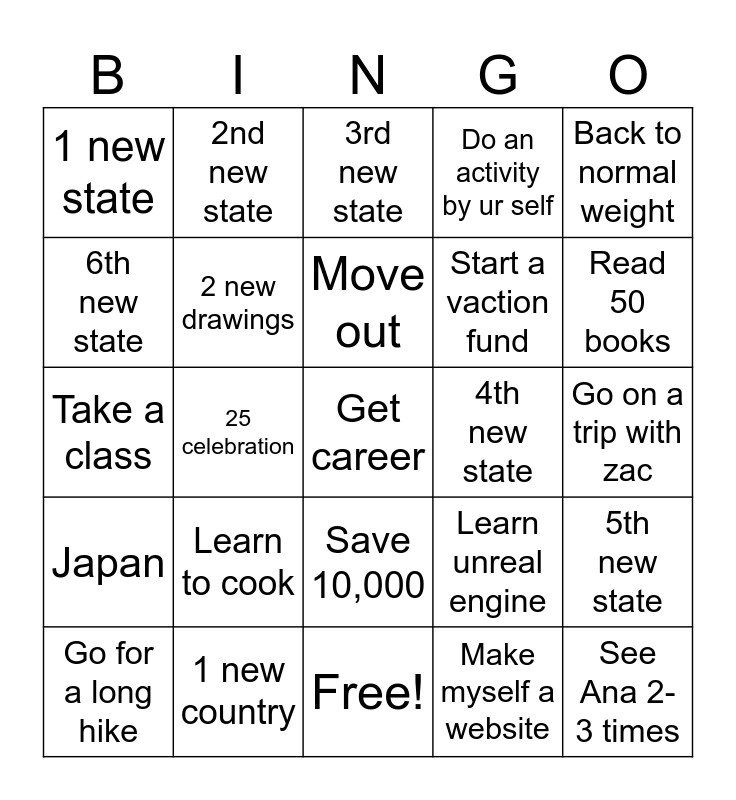 This bingo card has 25 words: Japan, 1 new country, Get career, Make myself a website, Back to normal weight, 1 new state, 2nd new state, 3rd new state, 4th new state, 5th new state, 6th new state, 2 new drawings, Free!, Learn unreal engine, Read 50 books, Go for a long hike, 25 celebration, Move out, Start a vaction fund, Go on a trip with zac, Take a class, Learn to cook, Save 10,000, Do an activity by ur self and See Ana 2-3 times.