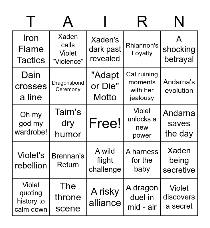 This bingo card has a free space and 37 words: Violet rides Tairn, Battle Briefing, Liam's Sacrifice, Dragonsbond Ceremony, Xaden being secretive, Brennan's Return, "Adapt or Die" Motto, A Griffin Encounter, A shocking betrayal, Violet and Xaden sparring, Tairn's dry humor, Rhiannon's Loyalty, Violet discovers a secret, Andarna saves the day, Dain crosses a line, Violet's rebellion, A shocking twist, Xaden's dark past revealed, A wild flight challenge, Violet unlocks a new power, Iron Flame Tactics, Andarna's evolution, Violet quoting history to calm down, A risky alliance, Violet's chronic pain, A dragon duel in mid - air, Xaden calls Violet "Violence", Violet mastering a new skill, Oranges, Andarna being too sassy, Lilith is a jerk, The throne scene, Oh my god my wardrobe!, Ridoc taking nothing seriously, A harness for the baby, Cat ruining moments with her jealousy and Outsmarting the obstacle course.