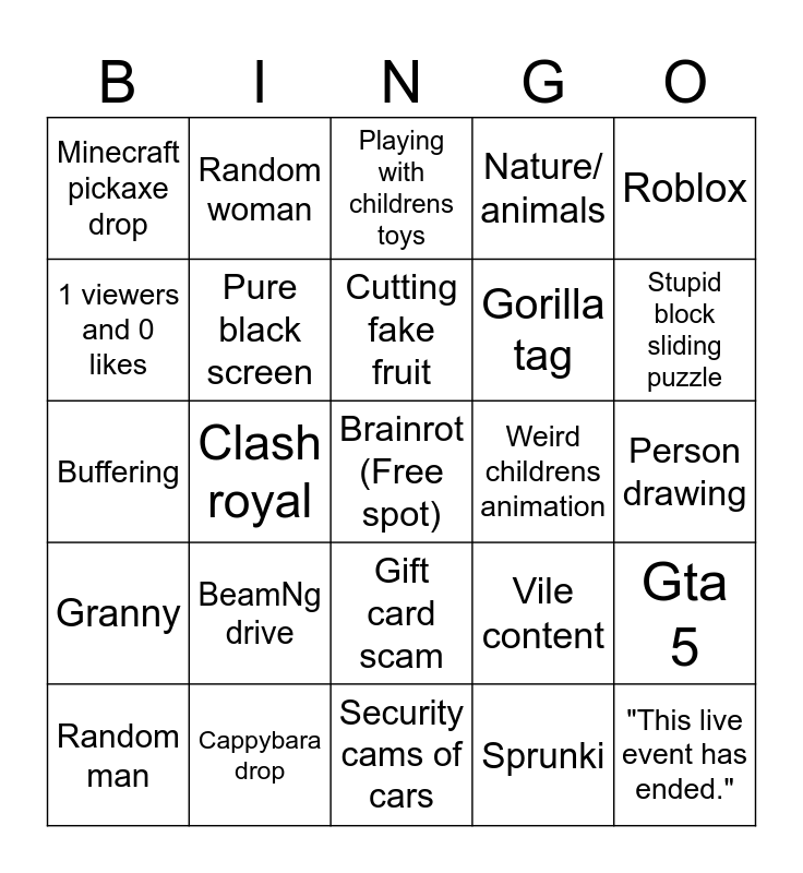 This bingo card has a free space and 34 words: Fortnite, Sprunki, Minecraft, Food, Granny, Pure black screen, Roblox, Random man, Random woman, Memes, Cutting fake fruit, Playing with childrens toys, Brainrot backround video, 144p video, Weird childrens animation, Stupid block sliding puzzle, Cappybara drop, Buffering, BeamNg drive, Vile content, Gift card scam, In-game currency scam, Minecraft pickaxe drop, Person drawing, Security cams of cars, "This live event has ended.", Nature/ animals, AI slop, Gorilla tag, 1 viewers and 0 likes, Furry, Clash royal, Gta 5 and Random mobile game.