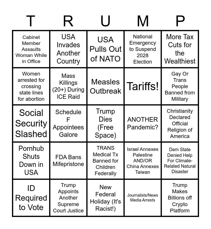 This bingo card has a free space and 24 words: FDA Bans Mifepristone, Trump Appoints Another Supreme Court Justice, Measles Outbreak, ID Required to Vote, More Tax Cuts for the Wealthiest, Cabinet Member Assaults Woman While in Office, Women arrested for crossing state lines for abortion, USA Invades Another Country, ANOTHER Pandemic?, TRANS Medical Tx Banned for Children Federally, Tariffs!, Social Security Slashed, Israel Annexes Palestine AND/OR China Annexes Taiwan, Dem State Denied Help For Climate-Related Natural Disaster, Mass Killings (20+) During ICE Raid, Journalists/News Media Arrests, Christianity Declared Official Religion of America, USA Pulls Out of NATO, Gay Or Trans People Banned from Military, Schedule F Appointees Galore, Trump Makes Billions off Crypto Platform, Pornhub Shuts Down in USA, National Emergency to Suspend 2028 Election and New Federal Holiday (It's Racist!).