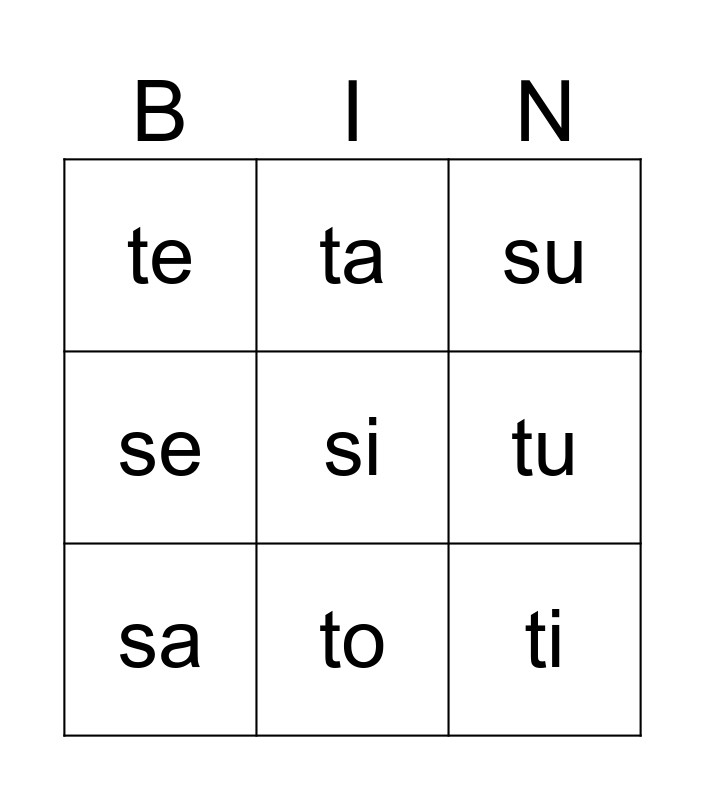 This bingo card has a free space and 9 words: sa, su, ta, se, te, tu, ti, so and to.