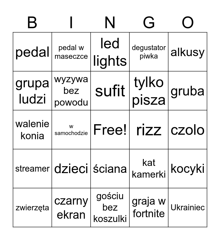 This bingo card has a free space and 40 words: pali na one, walenie konia, mowia siema skipuja, wyzywa bez powodu, czarny ekran, ściana, sufit, w masce, alkusy, streamer, w samochodzie, degustator piwka, Ukrainiec, czolo, rizz, dzieci, muzykant, pedal, starzy ludzie, led lights, kocyki, graja w fortnite, tylko pisza, grupa ludzi, przeglos, rzeczy do kamerki, pierdola głupoty, slychac ziomkow na dc, blondynka, para, kluby piłkarskie, zwierzęta, ciapaki, kat kamerki, gruba, gościu bez koszulki, podrywanie siebie, znana osoba, pedal w maseczce and gościu ze smoczkiem.