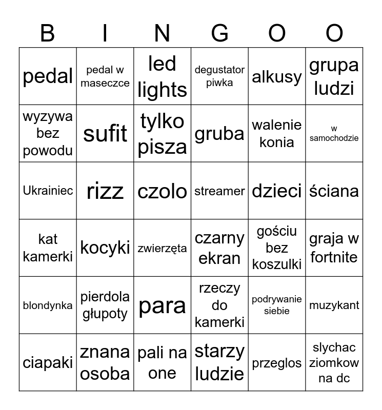 This bingo card has 40 words: pali na one, walenie konia, mowia siema skipuja, wyzywa bez powodu, czarny ekran, ściana, sufit, w masce, alkusy, streamer, w samochodzie, degustator piwka, Ukrainiec, czolo, rizz, dzieci, muzykant, pedal, starzy ludzie, led lights, kocyki, graja w fortnite, tylko pisza, grupa ludzi, przeglos, rzeczy do kamerki, pierdola głupoty, slychac ziomkow na dc, blondynka, para, kluby piłkarskie, zwierzęta, ciapaki, kat kamerki, gruba, gościu bez koszulki, podrywanie siebie, znana osoba, pedal w maseczce and gościu ze smoczkiem.