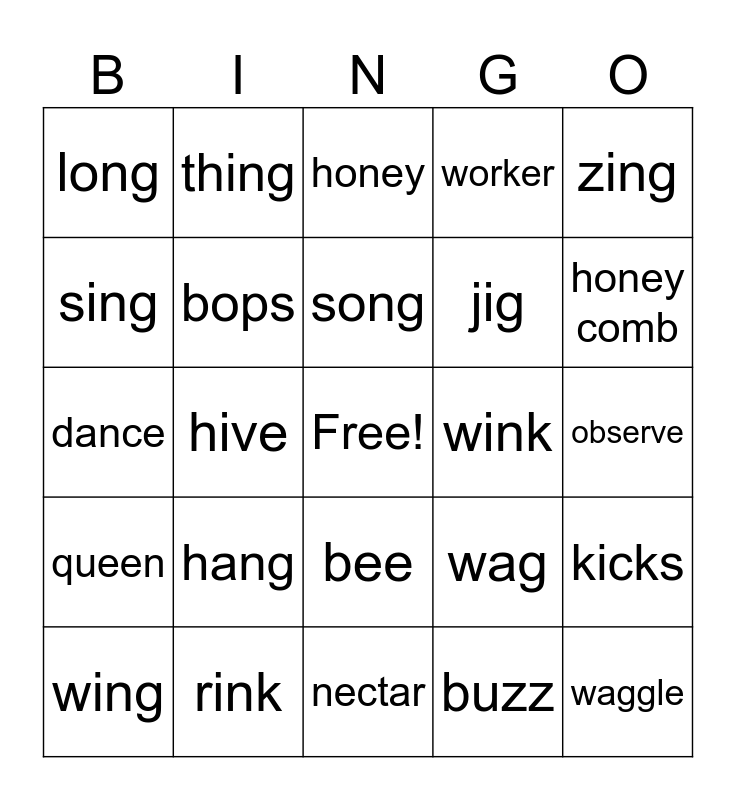 This bingo card has a free space and 24 words: hang, rink, song, wing, zing, long, sing, thing, wink, bee, jig, dance, wag, kicks, bops, buzz, observe, honey, honey comb, hive, waggle, queen, worker and nectar.