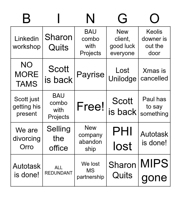 This bingo card has a free space and 32 words: Sharon Quits, Payrise, BAU combo with Projects, Orro is selling us, We are divorcing Orro, Scott is back, Keolis downer is out the door, Autotask is done!, Sharon Quits, Someone else Quits, Payrise, BAU combo with Projects, Orro is selling us, We are divorcing Orro, Scott is back, Keolis downer is out the door, Autotask is done!, Scott just getting his present, New company abandon ship, Selling the office, PHI lost, Wave on camera, Paul has to say something, ALL REDUNDANT, MIPS gone, New client, good luck everyone, Lost Unilodge, NO MORE TAMS, Linkedin workshop, We lost MS partnership, Expenses paid and Xmas is cancelled.