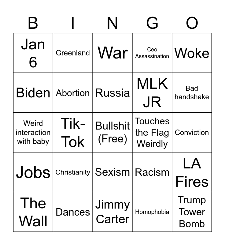 This bingo card has a free space and 33 words: Elon Musk, Assass-ination, Tik-Tok, China, Jobs, Abortion, Woke, The Wall, Greenland, Canada, Russia, War, Debt, MAGA, Touches the Flag Weirdly, Bad handshake, Dances, Weird interaction with baby, Christianity, Racism, Sexism, Onemonapea, Jan 6, Conviction, Jimmy Carter, Trump Tower Bomb, Ceo Assassination, MLK JR, Biden, LA Fires, Drones, Homophobia and Transphobia.