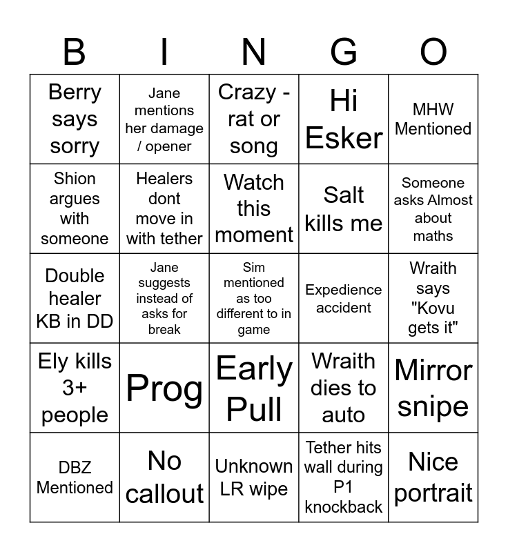 This bingo card has 25 words: Prog, Unknown LR wipe, Watch this moment, DBZ Mentioned, MHW Mentioned, Berry says sorry, Shion argues with someone, Jane mentions her damage / opener, Expedience accident, Early Pull, Salt kills me, Double healer KB in DD, Wraith dies to auto, Mirror snipe, Healers dont move in with tether, Nice portrait, Wraith says "Kovu gets it", Crazy - rat or song, Someone asks Almost about maths, Jane suggests instead of asks for break, Sim mentioned as too different to in game, No callout, Ely kills 3+ people, Hi Esker and Tether hits wall during P1 knockback.