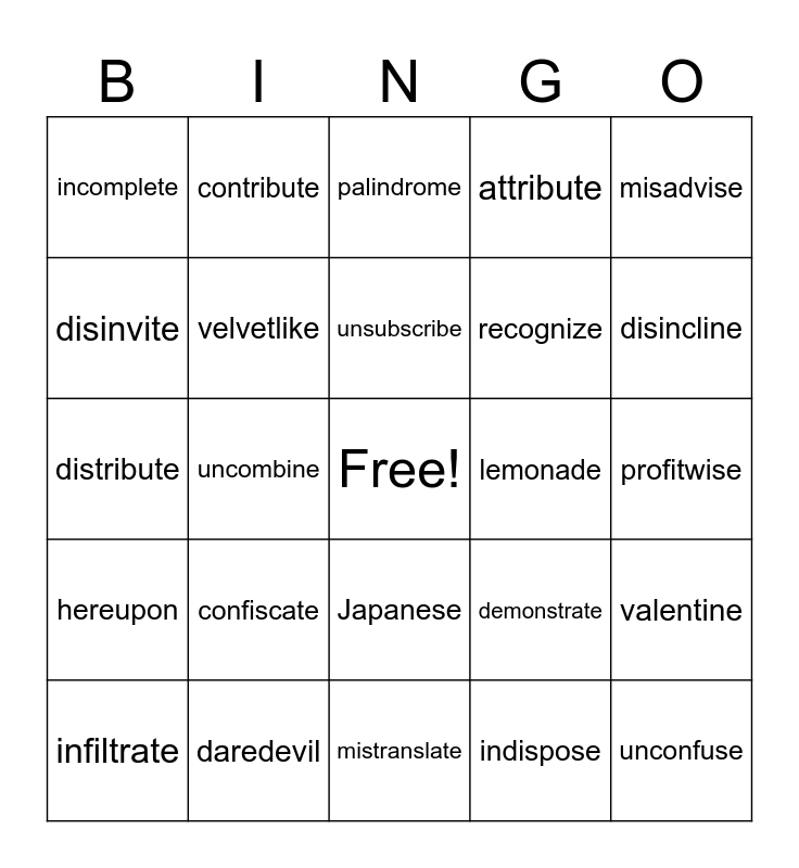 This bingo card has a free space and 24 words: confiscate, daredevil, unsubscribe, infiltrate, misadvise, incomplete, disinvite, contribute, lemonade, Japanese, recognize, distribute, demonstrate, valentine, velvetlike, indispose, profitwise, palindrome, disincline, uncombine, unconfuse, hereupon, attribute and mistranslate.
