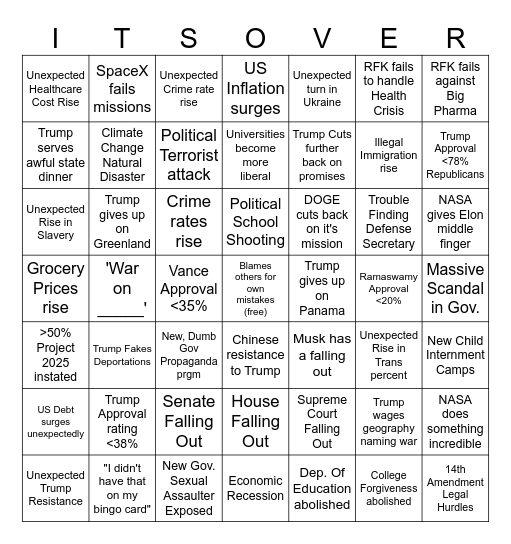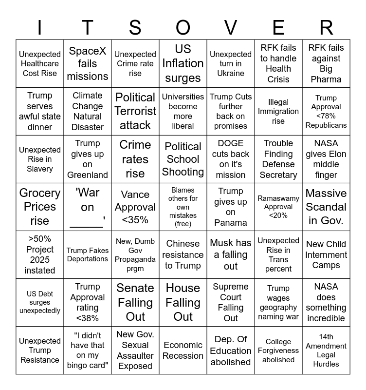 This bingo card has a free space and 54 words: Economic Recession, Trump gives up on Greenland, Trump gives up on Mars, Trump gives up on Panama, Political School Shooting, US Debt surges unexpectedly, US Inflation surges, Crypto Crash, RFK fails to handle Health Crisis, Trump Approval rating <38%, Unexpected Healthcare Cost Rise, Unexpected Rise in Trans percent, Grocery Prices rise, NASA gives Elon middle finger, NASA does something incredible, 'War on _____', Illegal Immigration rise, Climate Change Natural Disaster, Dep. Of Education abolished, Unexpected Rise in Slavery, DOGE cuts back on it's mission, Ramaswamy Approval <20%, Trump Approval <78% Republicans, Unexpected turn in Ukraine, College Forgiveness abolished, SpaceX fails missions, New, Dumb Gov Propaganda prgm, War on Encyclopedias / Data, Massive Scandal in Gov., Vance Approval <35%, Vance has a falling out, Musk has a falling out, Trump wages geography naming war, Unexpected Trump Resistance, Unexpected Crime rate rise, New Child Internment Camps, Universities become more liberal, Trouble Finding Defense Secretary, 14th Amendment Legal Hurdles, RFK fails against Big Pharma, Senate Falling Out, House Falling Out, Supreme Court Falling Out, EU gives Trump middle finger, Crime rates rise, "I didn't have that on my bingo card", Chinese resistance to Trump, >50% Project 2025 instated, Trump serves awful state dinner, Trump Cuts further back on promises, Political Terrorist attack, New Gov. Sexual Assaulter Exposed, Trump Fakes Deportations and New, Abysmal supreme court ruling.