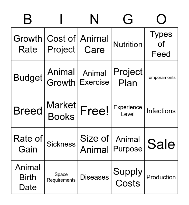 This bingo card has a free space and 33 words: Feed Costs, Records, Market Books, Veterinary Care, Rate of Gain, Animal Growth, Types of Feed, Animal Birth Date, Cost of Project, Feeding Schedules, Animal Exercise, Animal Care, Pictures, Animal Health, Experience Level, Temperaments, Space Requirements, Breed, Sickness, Animal Purpose, Size of Animal, Handling, Growth Rate, Infections, Diseases, Production, Nutrition, Project Plan, Budget, Sale, Timeline, Supply Costs and Weights.