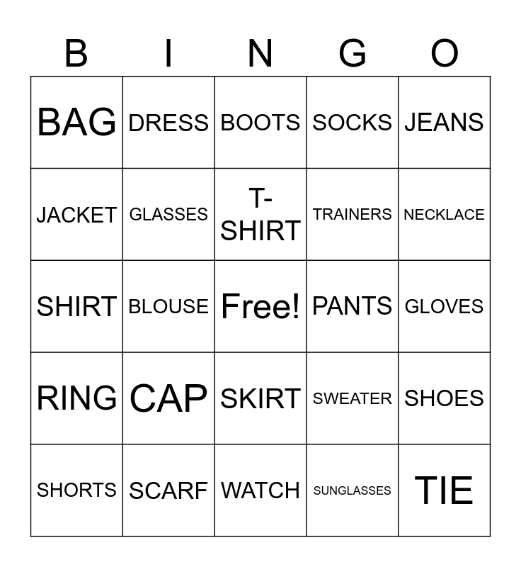 This bingo card has a free space and 25 words: CAP, WATCH, T-SHIRT, SHORTS, JEANS, BAG, JACKET, DRESS, PANTS, SKIRT, TRAINERS, SHIRT, SWEATER, SHOES, GLASSES, COAT, GLOVES, BOOTS, NECKLACE, BLOUSE, TIE, SCARF, RING, SOCKS and SUNGLASSES.