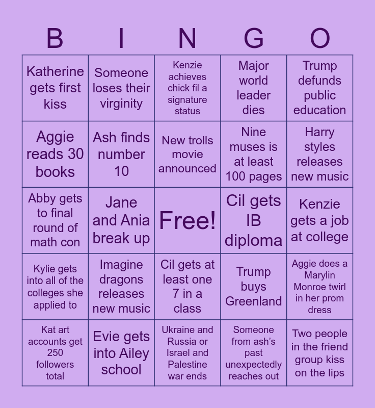 This bingo card has a free space and 24 words: Imagine dragons releases new music, Evie gets into Ailey school, New trolls movie announced, Kat art accounts get 250 followers total, Trump defunds public education, Katherine gets first kiss, Aggie reads 30 books, Someone loses their virginity, Cil gets IB diploma, Cil gets at least one 7 in a class, Nine muses is at least 100 pages, Abby gets to final round of math con, Trump buys Greenland, Aggie does a Marylin Monroe twirl in her prom dress, Ash finds number 10, Someone from ash’s past unexpectedly reaches out, Kenzie gets a job at college, Kenzie achieves chick fil a signature status, Harry styles releases new music, Jane and Ania break up, Two people in the friend group kiss on the lips, Kylie gets into all of the colleges she applied to, Major world leader dies and Ukraine and Russia or Israel and Palestine war ends.