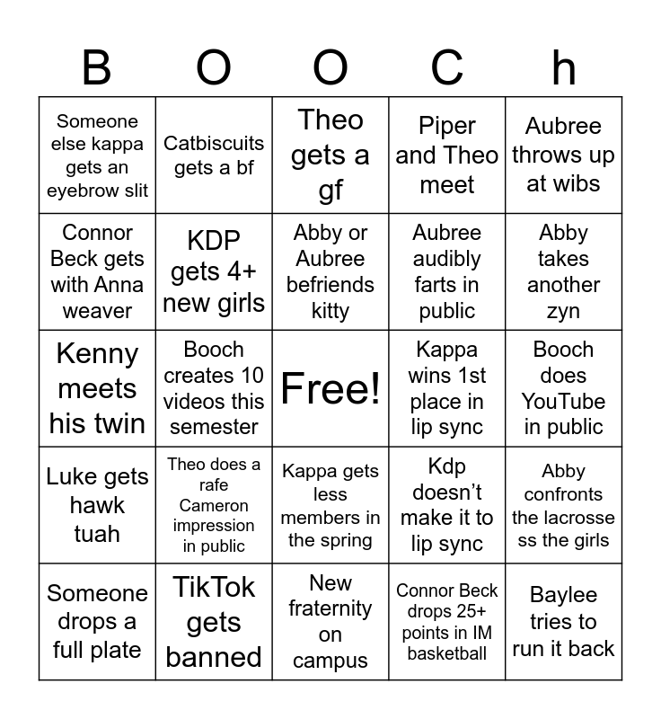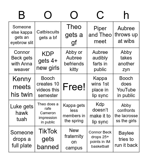 This bingo card has a free space and 24 words: Theo does a rafe Cameron impression in public, TikTok gets banned, Abby or Aubree befriends kitty, Someone drops a full plate, Aubree throws up at wibs, Someone else kappa gets an eyebrow slit, Connor Beck gets with Anna weaver, Catbiscuits gets a bf, Kappa wins 1st place in lip sync, Kappa gets less members in the spring, Aubree audibly farts in public, Kenny meets his twin, Kdp doesn’t make it to lip sync, Abby confronts the lacrosse ss the girls, KDP gets 4+ new girls, Connor Beck drops 25+ points in IM basketball, Booch does YouTube in public, Theo gets a gf, Abby takes another zyn, Booch creates 10 videos this semester, Baylee tries to run it back, Luke gets hawk tuah, Piper and Theo meet and New fraternity on campus.