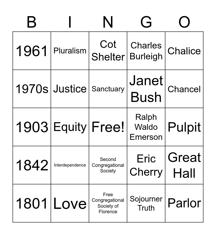This bingo card has a free space and 29 words: 1825, Love, Cot Shelter, Charles Forbes, Chalice, 1961, Justice, Sanctuary, Ralph Waldo Emerson, Great Hall, 1801, Equity, Sojourner Truth, Parlor, 1903, Transformation, Free Congregational Society of Florence, Eric Cherry, Chancel, 1842, Interdependence, The Underground Railroad, Janet Bush, Pulpit, 1970s, Pluralism, Second Congregational Society, Charles Burleigh and Organ.
