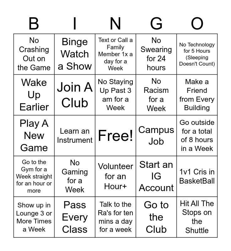 This bingo card has a free space and 24 words: No Gaming for a Week, Pass Every Class, No Staying Up Past 3 am for a Week, Show up in Lounge 3 or More Times a Week, No Technology for 5 Hours (Sleeping Doesn't Count), No Crashing Out on the Game, Wake Up Earlier, Binge Watch a Show, Campus Job, Volunteer for an Hour+, No Racism for a Week, Play A New Game, Start an IG Account, 1v1 Cris in BasketBall, Join A Club, Go to the Club, Go outside for a total of 8 hours in a Week, Text or Call a Family Member 1x a day for a Week, Make a Friend from Every Building, Learn an Instrument, Hit All The Stops on the Shuttle, Go to the Gym for a Week straight for an hour or more, No Swearing for 24 hours and Talk to the Ra's for ten mins a day for a week.
