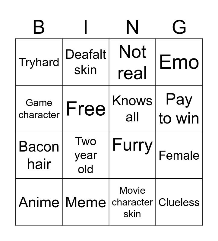 This bingo card has 18 words: Two year old, Clueless, Not real, Tryhard, Furry, Emo, Anime, Deafalt skin, Pay to win, Bacon hair, Movie character skin, Game character, Female, Free, Knows all, Food character, Meme and Gay.