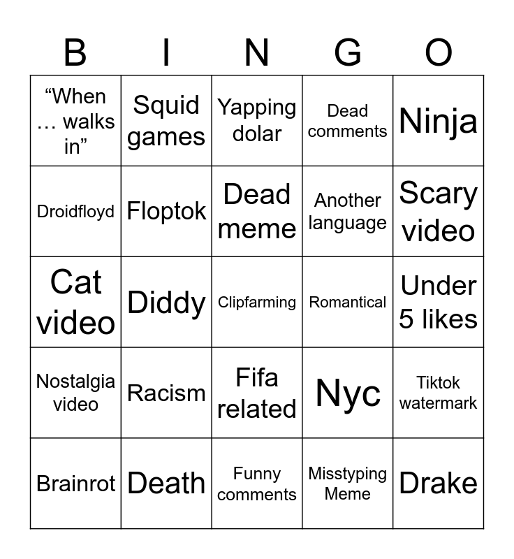 This bingo card has a free space and 24 words: Racism, Death, Dead meme, Brainrot, Ninja, “When … walks in”, Droidfloyd, Squid games, Romantical, Fifa related, Another language, Cat video, Nyc, Tiktok watermark, Floptok, Misstyping Meme, Under 5 likes, Yapping dolar, Scary video, Diddy, Drake, Nostalgia video, Dead comments and Funny comments.