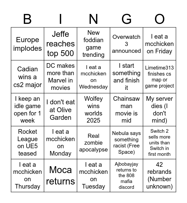 This bingo card has 25 words: I eat a mcchicken on Monday, I eat a mcchicken on Tuesday, I eat a mcchicken on Wednesday, I eat a mcchicken on Thursday, I eat a mcchicken on Friday, Europe implodes, Cadian wins a cs2 major, Jeffe reaches top 500, Chainsaw man movie is mid, Real zombie apocalypse, I start something and finish it, I keep an idle game open for 1 week, Nebula says something racist (Free Space), Switch 2 sells more units than Switch in first month, DC makes more than Marvel in movies, 42 rebrands (Number unknown), My server dies (I don't mind), New foddian game trending, Limetime313 finishes cs map or game project, I don't eat at Olive Garden, Wolfey wins worlds 2025, Moca returns, Rocket League on UE5 teased, Overwatch 3 announced and Ajbobayjay returns to the 808 mafia discord.