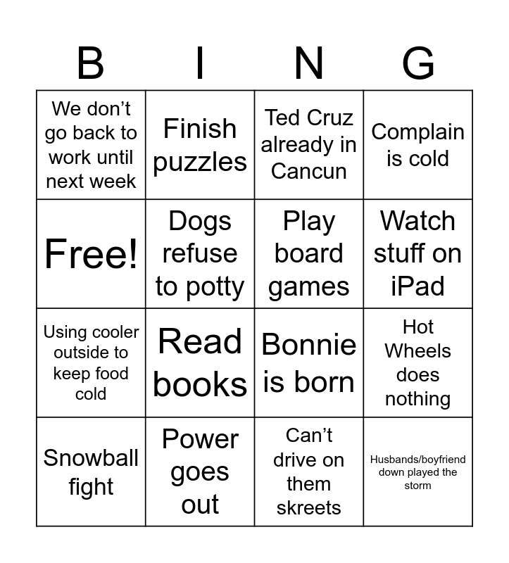 This bingo card has 16 words: Power goes out, Hot Wheels does nothing, Ted Cruz already in Cancun, We don’t go back to work until next week, Using cooler outside to keep food cold, Finish puzzles, Bonnie is born, Can’t drive on them skreets, Free!, Dogs refuse to potty, Snowball fight, Complain is cold, Read books, Watch stuff on iPad, Play board games and Husbands/boyfriend down played the storm.