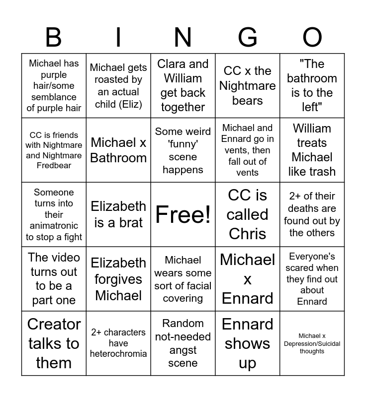 This bingo card has a free space and 24 words: Elizabeth forgives Michael, 2+ characters have heterochromia, Some weird 'funny' scene happens, Creator talks to them, "The bathroom is to the left", Michael has purple hair/some semblance of purple hair, CC is friends with Nightmare and Nightmare Fredbear, Michael gets roasted by an actual child (Eliz), CC is called Chris, Michael wears some sort of facial covering, Michael and Ennard go in vents, then fall out of vents, Someone turns into their animatronic to stop a fight, Michael x Ennard, Everyone's scared when they find out about Ennard, Michael x Bathroom, Ennard shows up, 2+ of their deaths are found out by the others, Clara and William get back together, William treats Michael like trash, Elizabeth is a brat, Michael x Depression/Suicidal thoughts, The video turns out to be a part one, CC x the Nightmare bears and Random not-needed angst scene.