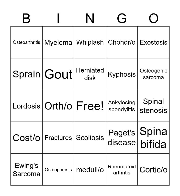 This bingo card has a free space and 24 words: Fractures, Osteoporosis, Herniated disk, Ewing's Sarcoma, Exostosis, Osteoarthritis, Sprain, Myeloma, Ankylosing spondylitis, Scoliosis, Kyphosis, Lordosis, Paget's disease, Spina bifida, Gout, Rheumatoid arthritis, Spinal stenosis, Whiplash, Osteogenic sarcoma, Orth/o, Cortic/o, Cost/o, Chondr/o and medull/o.
