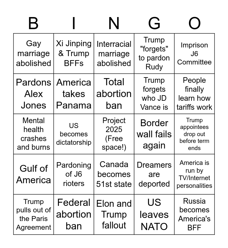 This bingo card has a free space and 30 words: Federal abortion ban, Assassination attempt, US becomes dictatorship, Civil War II, Gay marriage abolished, Interracial marriage abolished, America takes Panama, Canada becomes 51st state, Border wall fails again, Elon and Trump fallout, Trump appointees drop out before term ends, Russia becomes America's BFF, US leaves NATO, Prices soar from tariffs, People finally learn how tariffs work, Christianity becomes official religion of US, Dreamers are deported, Gulf of America, Pardoning of J6 rioters, Imprison J6 Committee, Mental health crashes and burns, California offers to trade statehood with Canada, Xi Jinping & Trump BFFs, Trump forgets who JD Vance is, Pardons Alex Jones, Trump "forgets" to pardon Rudy, America is run by TV/Internet personalities, Trump pulls out of the Paris Agreement, Total abortion ban and Jan 6 becomes federal holiday.