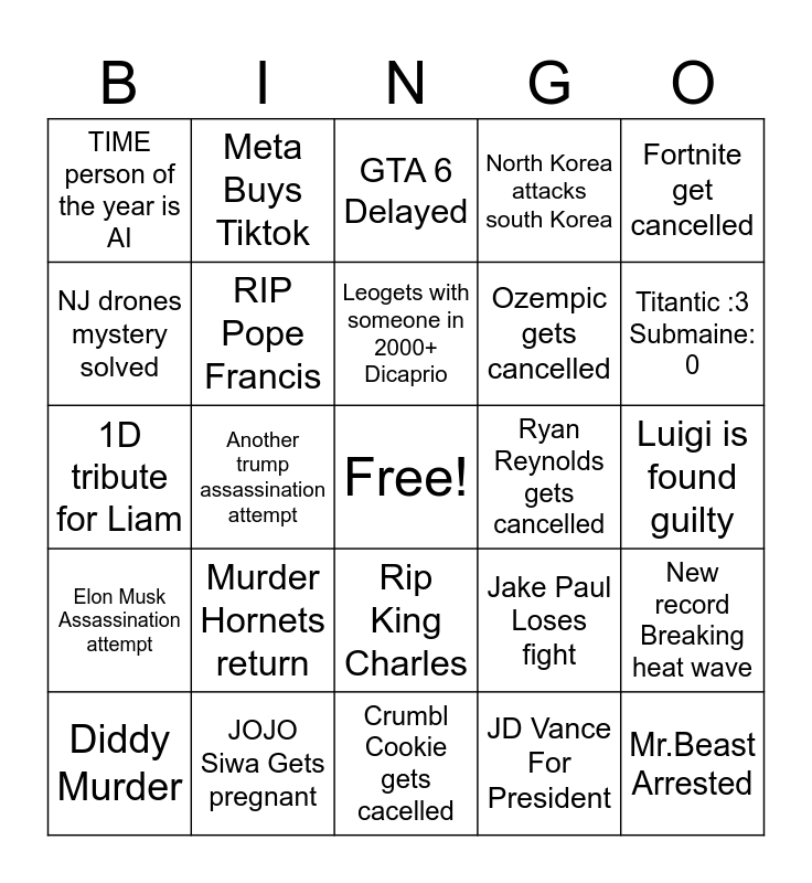 This bingo card has a free space and 24 words: Murder Hornets return, JOJO Siwa Gets pregnant, Leogets with someone in 2000+ Dicaprio, Diddy Murder, Fortnite get cancelled, TIME person of the year is AI, NJ drones mystery solved, Meta Buys Tiktok, Ryan Reynolds gets cancelled, Rip King Charles, Ozempic gets cancelled, 1D tribute for Liam, Jake Paul Loses fight, New record Breaking heat wave, RIP Pope Francis, JD Vance For President, Luigi is found guilty, GTA 6 Delayed, Titantic :3 Submaine: 0, Another trump assassination attempt, Mr.Beast Arrested, Elon Musk Assassination attempt, North Korea attacks south Korea and Crumbl Cookie gets cacelled.