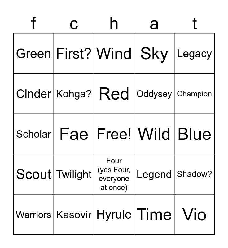 This bingo card has a free space and 24 words: Twilight, Kasovir, Red, Warriors, Legacy, Green, Cinder, First?, Wild, Four (yes Four, everyone at once), Oddysey, Scholar, Legend, Shadow?, Kohga?, Time, Blue, Wind, Champion, Fae, Vio, Scout, Sky and Hyrule.