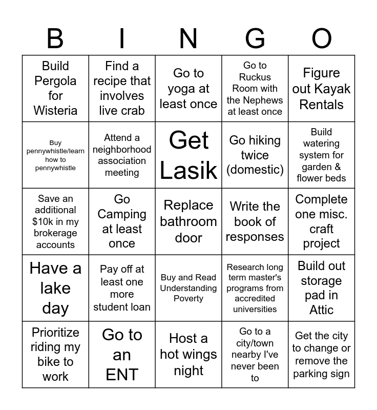 This bingo card has a free space and 24 words: Pay off at least one more student loan, Go to an ENT, Get Lasik, Prioritize riding my bike to work, Figure out Kayak Rentals, Build Pergola for Wisteria, Buy pennywhistle/learn how to pennywhistle, Find a recipe that involves live crab, Write the book of responses, Buy and Read Understanding Poverty, Go hiking twice (domestic), Save an additional $10k in my brokerage accounts, Research long term master's programs from accredited universities, Build out storage pad in Attic, Attend a neighborhood association meeting, Go to a city/town nearby I've never been to, Complete one misc. craft project, Go to yoga at least once, Build watering system for garden & flower beds, Go Camping at least once, Get the city to change or remove the parking sign, Have a lake day, Go to Ruckus Room with the Nephews at least once and Host a hot wings night.