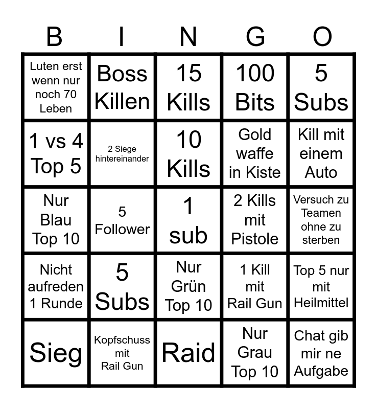 This bingo card has a free space and 24 words: 5 Subs, Kopfschuss mit Rail Gun, 10 Kills, Sieg, 5 Subs, Luten erst wenn nur noch 70 Leben, 1 vs 4 Top 5, Boss Killen, 2 Kills mit Pistole, Nur Grün Top 10, Gold waffe in Kiste, Nur Blau Top 10, 1 Kill mit Rail Gun, Top 5 nur mit Heilmittel, 2 Siege hintereinander, Nur Grau Top 10, Versuch zu Teamen ohne zu sterben, 15 Kills, Kill mit einem Auto, 5 Follower, Chat gib mir ne Aufgabe, Nicht aufreden 1 Runde, 100 Bits and Raid.