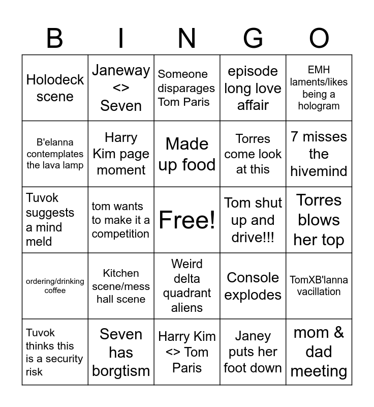 This bingo card has a free space and 24 words: Kitchen scene/mess hall scene, Seven has borgtism, Made up food, Tuvok thinks this is a security risk, EMH laments/likes being a hologram, Holodeck scene, B'elanna contemplates the lava lamp, Janeway <> Seven, Tom shut up and drive!!!, Weird delta quadrant aliens, Torres come look at this, Tuvok suggests a mind meld, Console explodes, TomXB'lanna vacillation, Harry Kim page moment, Janey puts her foot down, Torres blows her top, Someone disparages Tom Paris, 7 misses the hivemind, tom wants to make it a competition, mom & dad meeting, ordering/drinking coffee, episode long love affair and Harry Kim <> Tom Paris.