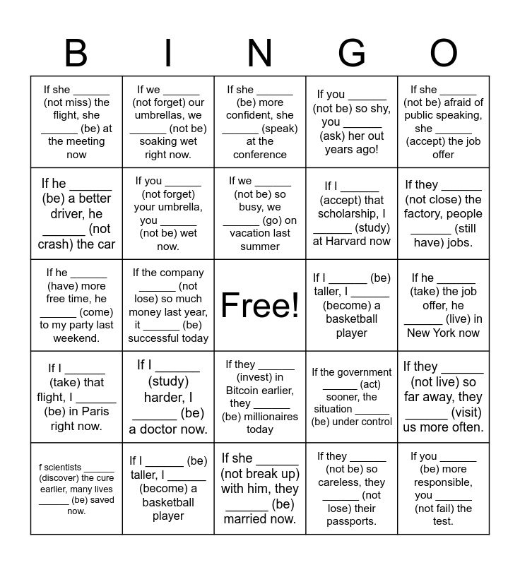 This bingo card has a free space and 24 words: If I ______ (study) harder, I ______ (be) a doctor now., If I ______ (be) taller, I ______ (become) a basketball player, If we ______ (not be) so busy, we ______ (go) on vacation last summer, f scientists ______ (discover) the cure earlier, many lives ______ (be) saved now., If she ______ (not be) afraid of public speaking, she ______ (accept) the job offer, If she ______ (not miss) the flight, she ______ (be) at the meeting now, If he ______ (be) a better driver, he ______ (not crash) the car, If we ______ (not forget) our umbrellas, we ______ (not be) soaking wet right now., If I ______ (be) taller, I ______ (become) a basketball player, If they ______ (invest) in Bitcoin earlier, they ______ (be) millionaires today, If I ______ (accept) that scholarship, I ______ (study) at Harvard now, If he ______ (have) more free time, he ______ (come) to my party last weekend., If the government ______ (act) sooner, the situation ______ (be) under control, If they ______ (not live) so far away, they ______ (visit) us more often., If you ______ (not forget) your umbrella, you ______ (not be) wet now., If they ______ (not be) so careless, they ______ (not lose) their passports., If he ______ (take) the job offer, he ______ (live) in New York now, If she ______ (be) more confident, she ______ (speak) at the conference, If they ______ (not close) the factory, people ______ (still have) jobs., If the company ______ (not lose) so much money last year, it ______ (be) successful today, If you ______ (be) more responsible, you ______ (not fail) the test., If I ______ (take) that flight, I ______ (be) in Paris right now., If you ______ (not be) so shy, you ______ (ask) her out years ago! and If she ______ (not break up) with him, they ______ (be) married now..