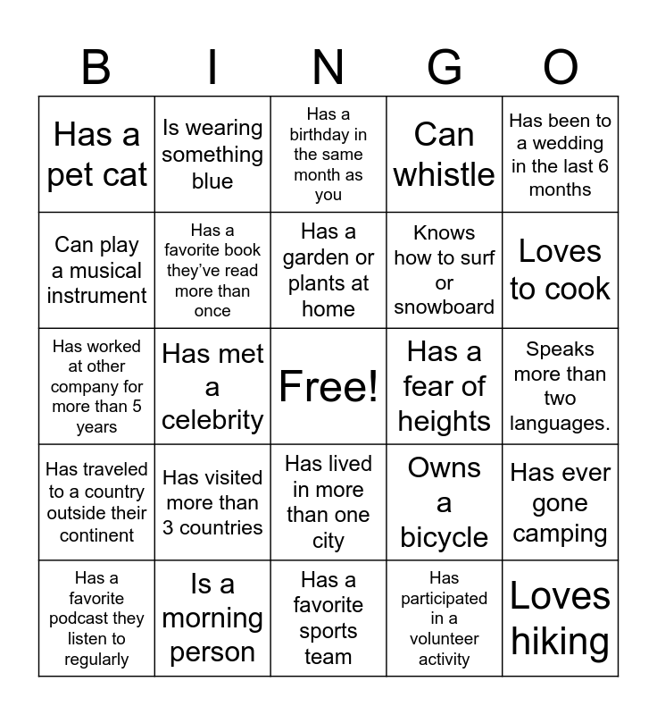 This bingo card has a free space and 24 words: Has visited more than 3 countries, Is a morning person, Has a garden or plants at home, Has a favorite podcast they listen to regularly, Has been to a wedding in the last 6 months, Has a pet cat, Can play a musical instrument, Is wearing something blue, Has a fear of heights, Has lived in more than one city, Knows how to surf or snowboard, Has worked at other company for more than 5 years, Owns a bicycle, Has ever gone camping, Has a favorite book they’ve read more than once, Has participated in a volunteer activity, Speaks more than two languages., Has a birthday in the same month as you, Loves to cook, Has met a celebrity, Loves hiking, Has traveled to a country outside their continent, Can whistle and Has a favorite sports team.