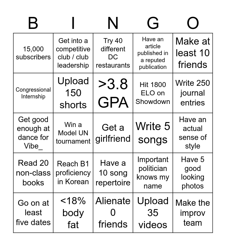 This bingo card has a free space and 24 words: Reach B1 proficiency in Korean, <18% body fat, >3.8 GPA, Go on at least five dates, Make at least 10 friends, 15,000 subscribers, Congressional Internship, Get into a competitive club / club leadership, Write 5 songs, Have a 10 song repertoire, Hit 1800 ELO on Showdown, Get good enough at dance for Vibe_, Important politician knows my name, Have 5 good looking photos, Upload 150 shorts, Upload 35 videos, Have an actual sense of style, Try 40 different DC restaurants, Write 250 journal entries, Win a Model UN tournament, Make the improv team, Read 20 non-class books, Have an article published in a reputed publication and Alienate 0 friends.