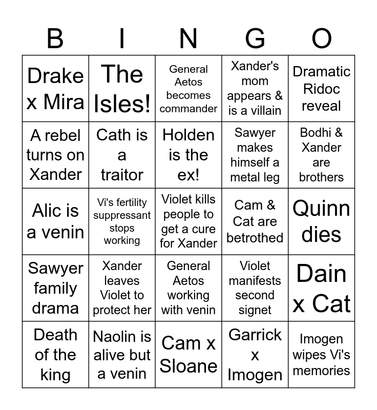 This bingo card has 25 words: Xander leaves Violet to protect her, Cam x Sloane, Holden is the ex!, Death of the king, Dramatic Ridoc reveal, Drake x Mira, A rebel turns on Xander, The Isles!, Cam & Cat are betrothed, General Aetos working with venin, Sawyer makes himself a metal leg, Alic is a venin, Violet manifests second signet, Dain x Cat, Cath is a traitor, Imogen wipes Vi's memories, Quinn dies, General Aetos becomes commander, Bodhi & Xander are brothers, Vi's fertility suppressant stops working, Violet kills people to get a cure for Xander, Naolin is alive but a venin, Sawyer family drama, Xander's mom appears & is a villain and Garrick x Imogen.