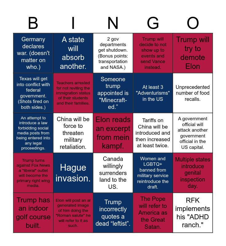 This bingo card has 25 words: Hague invasion., Trump incorrectly quotes a dead “leftist”., Someone trump appointed is "Minecraft-ed.”, Trump has an indoor golf course built., Trump will try to demote Elon, Germany declares war. (doesn't matter on who.), Texas will get into conflict with federal government. (Shots fired on both sides.), A state will absorb another., Tariffs on China will be introduced and then increased at least twice., Canada willingly surrenders land to the US., At least 3 "Adventurisms" in the US, An attempt to introduce a law forbidding social media posts from being entered into any legal proceedings., Women and LGBTQ+ banned from military service reintroduce the draft., Multiple states introduce genital inspection day., Teachers arrested for not reviling the immigration status of their students and their families., RFK implements his "ADHD ranch.", A government official will attack another government official in the US capital., 2 gov departments get shutdown. (Bonus points: transportation and NASA.), Unprecedented number of food recalls., China will be force to threaten military retaliation., Elon reads an excerpt from mein kampf., Elon will post an ai generated image of him doing the "Roman salute" he will refer to it as such., Trump turns against Fox News a "liberal" outlet will become the primary right wing media., Trump will decide to not show up to events and send Vance instead. and The Pope will refer to America as the Great Satan..