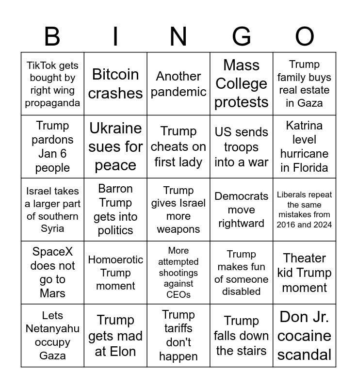 This bingo card has a free space and 24 words: Homoerotic Trump moment, Trump gets mad at Elon, Trump cheats on first lady, Lets Netanyahu occupy Gaza, Trump family buys real estate in Gaza, TikTok gets bought by right wing propaganda, Trump pardons Jan 6 people, Bitcoin crashes, Democrats move rightward, More attempted shootings against CEOs, US sends troops into a war, Israel takes a larger part of southern Syria, Trump makes fun of someone disabled, Theater kid Trump moment, Ukraine sues for peace, Trump falls down the stairs, Liberals repeat the same mistakes from 2016 and 2024, Another pandemic, Katrina level hurricane in Florida, Barron Trump gets into politics, Don Jr. cocaine scandal, SpaceX does not go to Mars, Mass College protests and Trump tariffs don't happen.